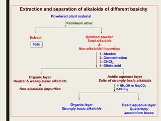 Acidbase extraction is a procedure using sequential liquidliquid extractions to purify acids and bases from mixtures based on their chemical properties. The alkaloids as bases precipitate and dissolve in the organic phase. A base is then added to convert alkaloids to basic forms that are extracted with organic solvent if the extraction was performed with alcohol it is removed first and the remainder is dissolved in water A base is then added to convert alkaloids to basic forms that are extracted with organic solvent if the extraction was performed with.